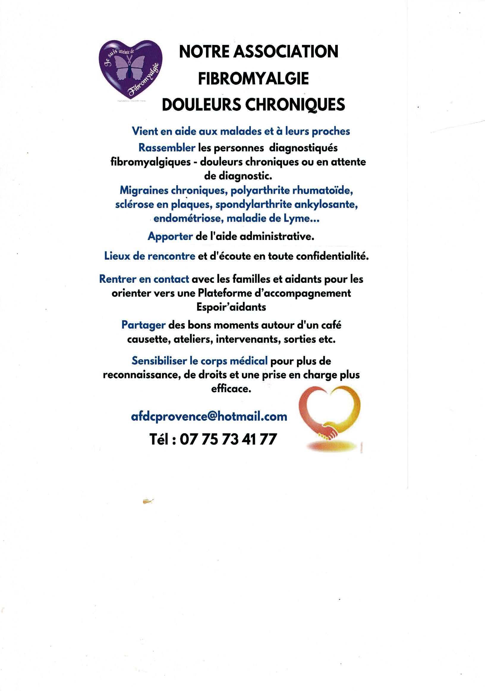 - AFDC Provence ; Association Fibromyalgie Douleurs Chroniques. 07 75 73 41 77 afdcprovence@hotmail.com