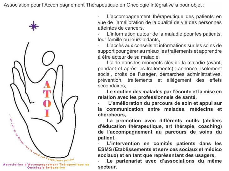 - Association ATOI, Association Accompagnement Thérapeutique en Oncologie Intégrative. Alexandra JOURDAN 06 77 78 47 89