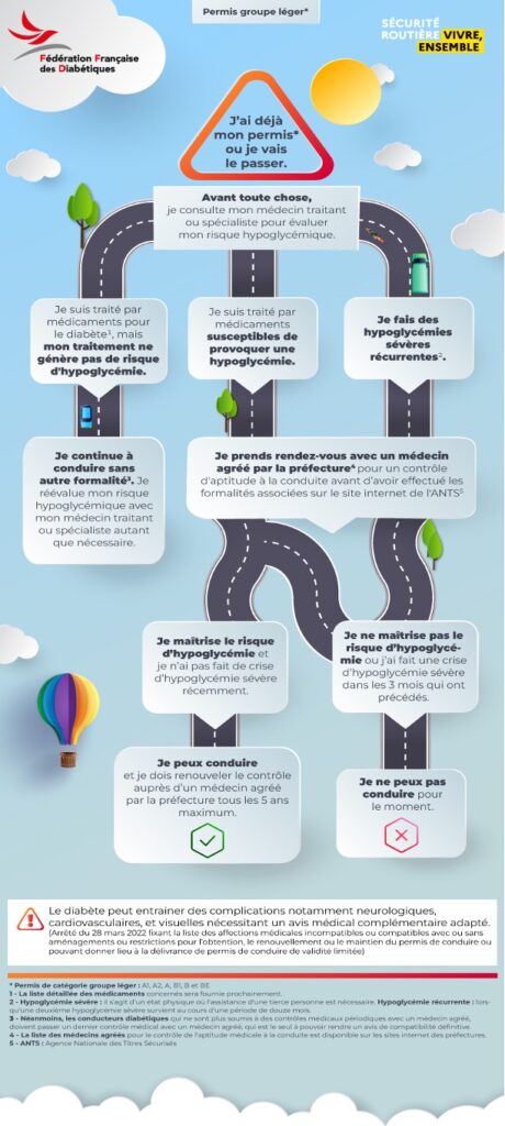 La législation relative au permis de conduire impose un contrôle médical d’aptitude à la conduite pour les conducteurs sous traitement avec un risque d’hypoglycémie. Un médicament hypoglycémiant est un médicament qui peut faire baisser le taux de sucre dans le sang et provoquer une hypoglycémie. Les molécules pouvant entraîner ces effets sont l’insuline, les sulfamides hypoglycémiants et les glinides. Pour savoir si vous êtes dans cette situation, contactez votre médecin généraliste ou spécialiste !